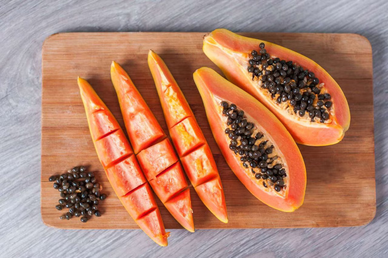 Papaja to duży, soczysty owoc tropikalny, charakteryzujący się intensywnie pomarańczowym miąższem oraz słodkim smakiem. Idealnie nadaje się do przygotowywania sałatek owocowych, smoothie oraz świeżych soków. W sklepie internetowym ryneczekpiastowski.pl w Bydgoszczy oferujemy najwyższej jakości papaję, która dostarczy Ci niezapomnianych doznań smakowych.. Cena za 1 sztukę